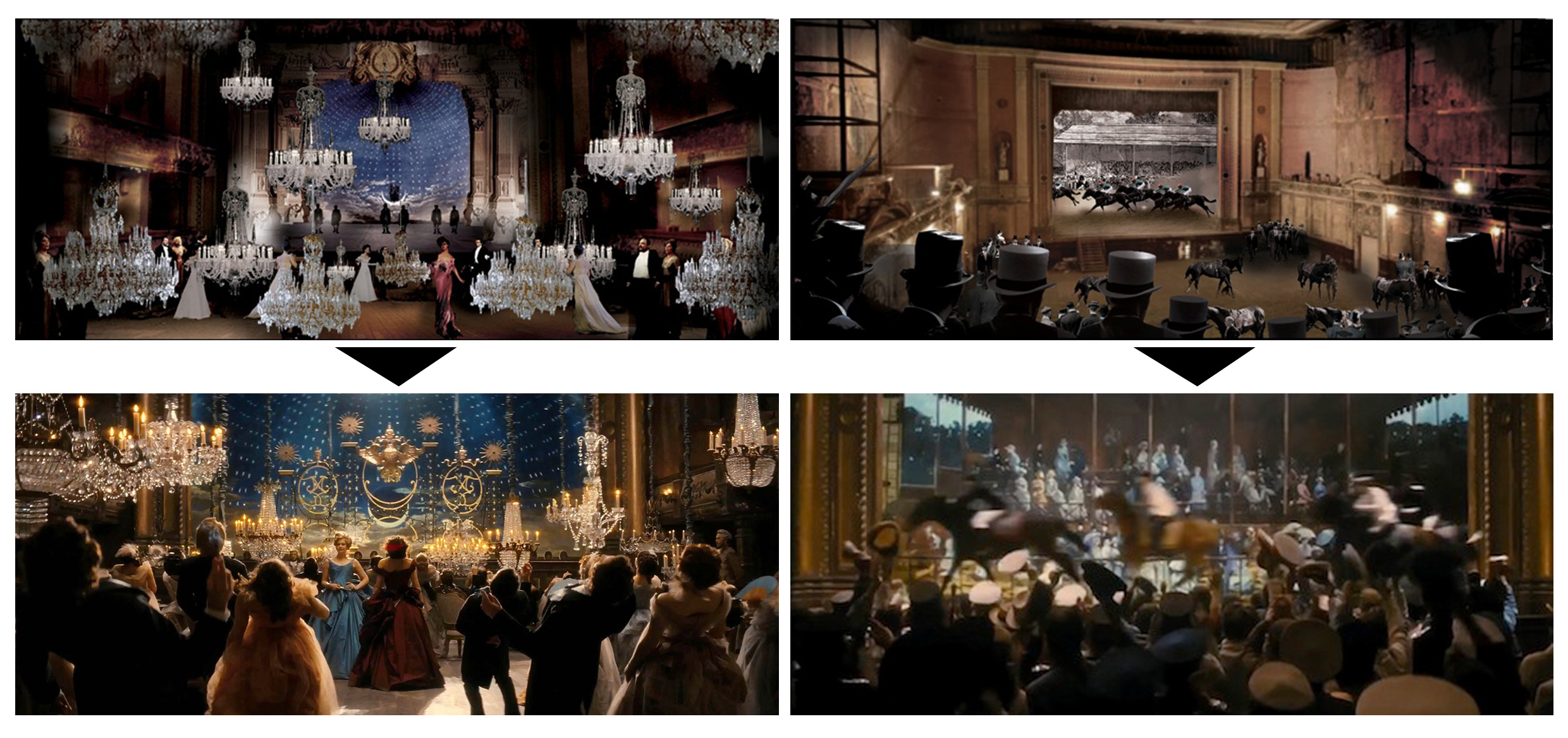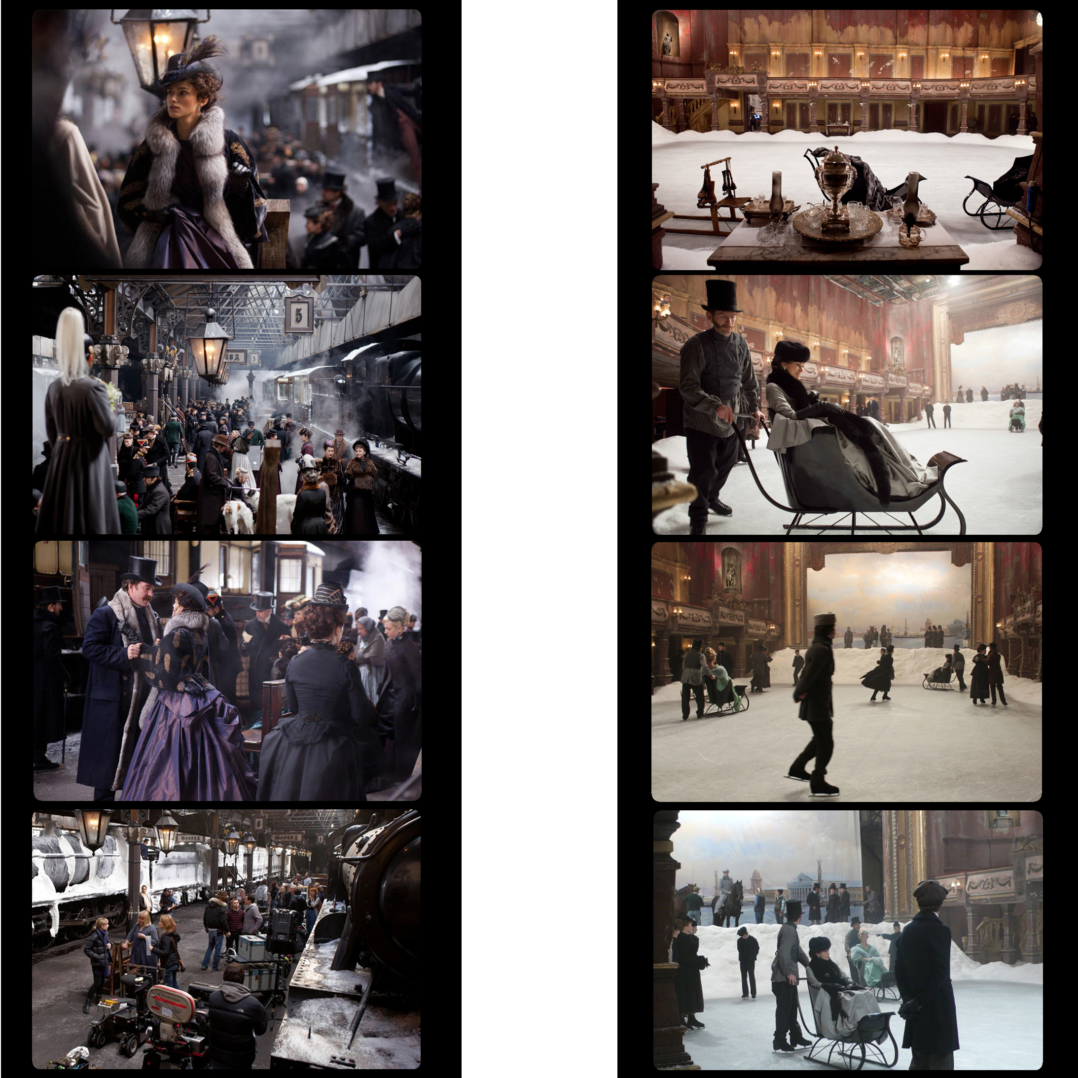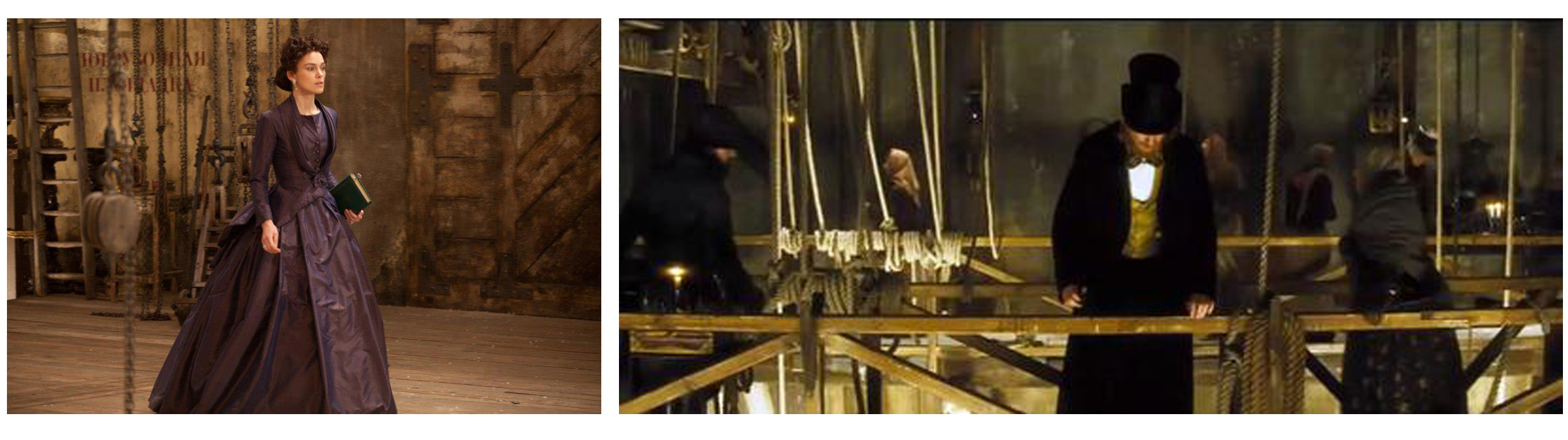 Dovete sapere che l’intero film, che a questo punto stasera dovrete vedere per forza, è ambientato in un teatro. Sì, il mio amato luogo di elezione, il posto in cui tutto più divenire ed avvenire! L’intera storia si sviluppa infatti all’interno di un teatro vuoto che, proprio come negli spettacoli teatrali avviene, di volta in volta diviene stazione, camera, città, pista di pattinaggio, arena per la corsa dei cavalli, verde campagna al tempo del raccolto, e così via. Come è possibile ciò? Con le tecniche tradizionali del teatro dell’Ottocento. Con le quinte fisse ed i soffitti che calano creando salotti o spalti, con i fondali dipinti, con le luci della ribalta costantemente accese, perchè allora Wagner non aveva ancora riportato il buio in platea, con le corde ed i macchinisti, che in graticcia ricreano i vicoli nascosti della Mosca “carbonara”.