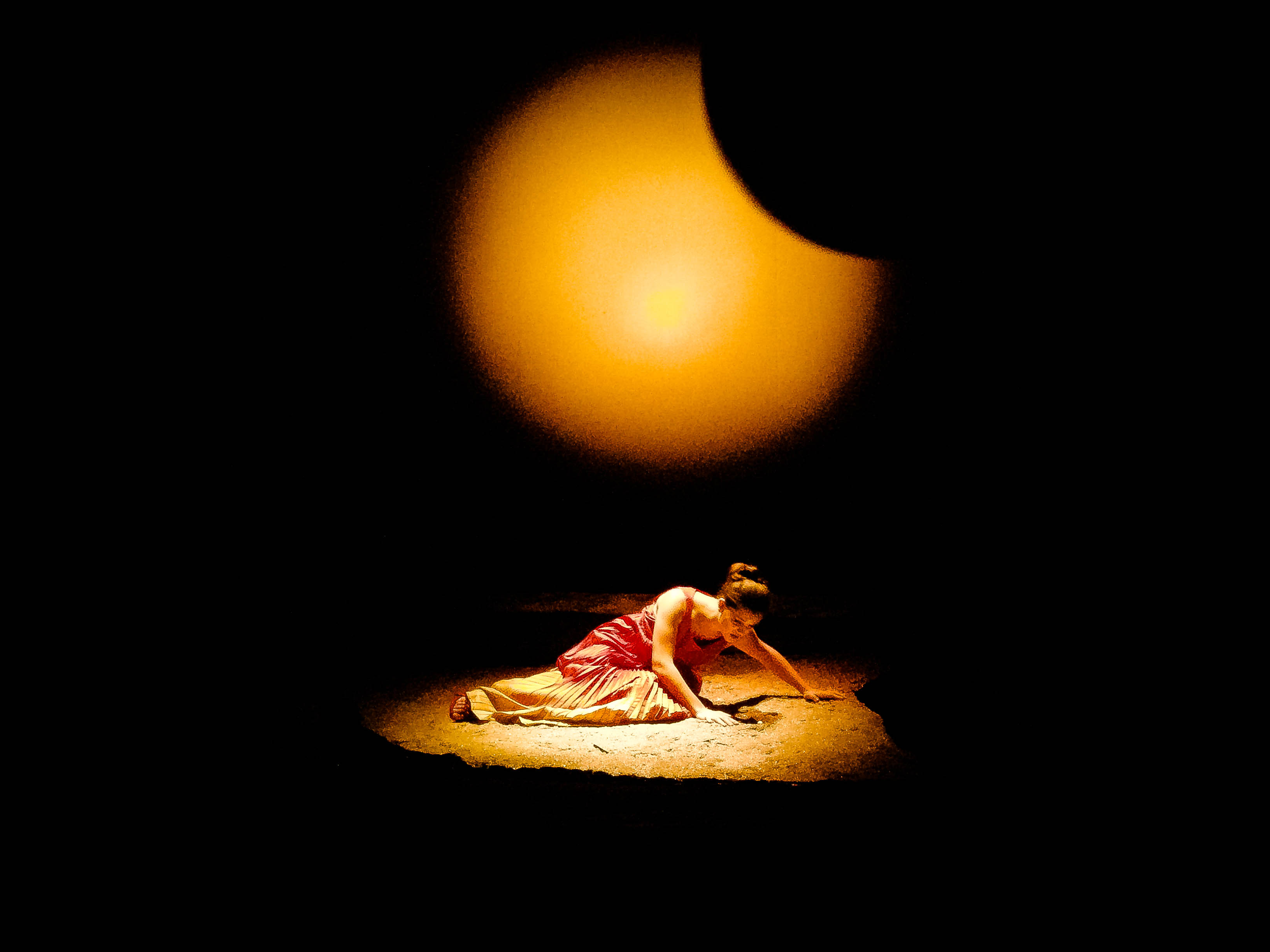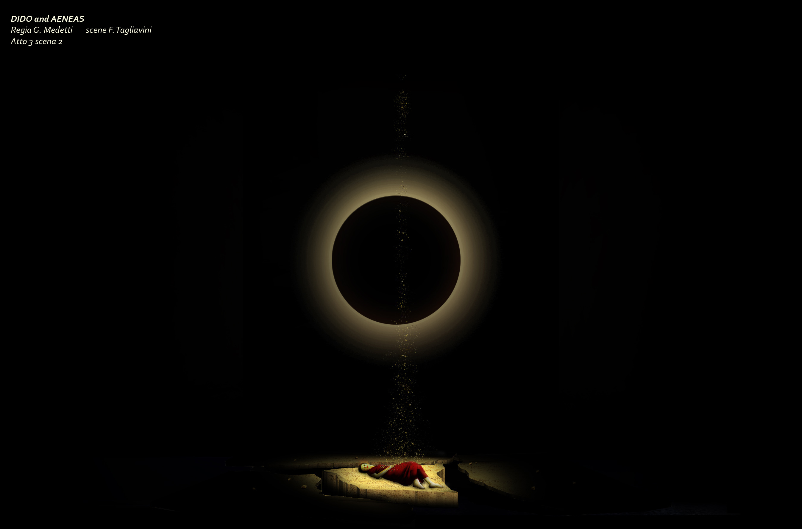Finalmente, eccoci all’eclissi. Capite bene che in uno spettacolo simbolico, che è stato definito come tale per molteplici motivi, non solo per l’analisi della storia e del personaggio di Didone (primo fra tutti il fatto che l’opera nasce come masque, non un’opera lirica, ma uno spettacolo tradizionale inglese tra rappresentazione, festa e danza, caratterizzato da simboli fissi e ricorrenti), la morte della protagonista non poteva essere sporcata da sangue finto che colava a fiotti a ricoprire la mia fantastica pedana! Come vi ho detto prima, Didone è la sua terra e, difatti, per tutto lo spettacolo essa rimane inclusa nel suo spazio, che scenicamente è stato reso con una pedana inclinata, ricoperta di sabbia. Alla sua morte la pedana si spezza, il suo regno, lei stessa, si frantuma. Non solo. Oltre ad Elissa, a Didone vengono attribuiti molti altri nomi: Ester, Astarte, Iside. Nella cultura babilonese Astar è la dea più importante, chiamata “signora del cielo”, colei che abita l’aria. E’ la dea della fecondità, dell’amore e della guerra (dualismo che torna spessissimo nelle vicende mitologiche). Inoltre ad Aster è attribuita la prima stella del mattino e l’ultima della sera.