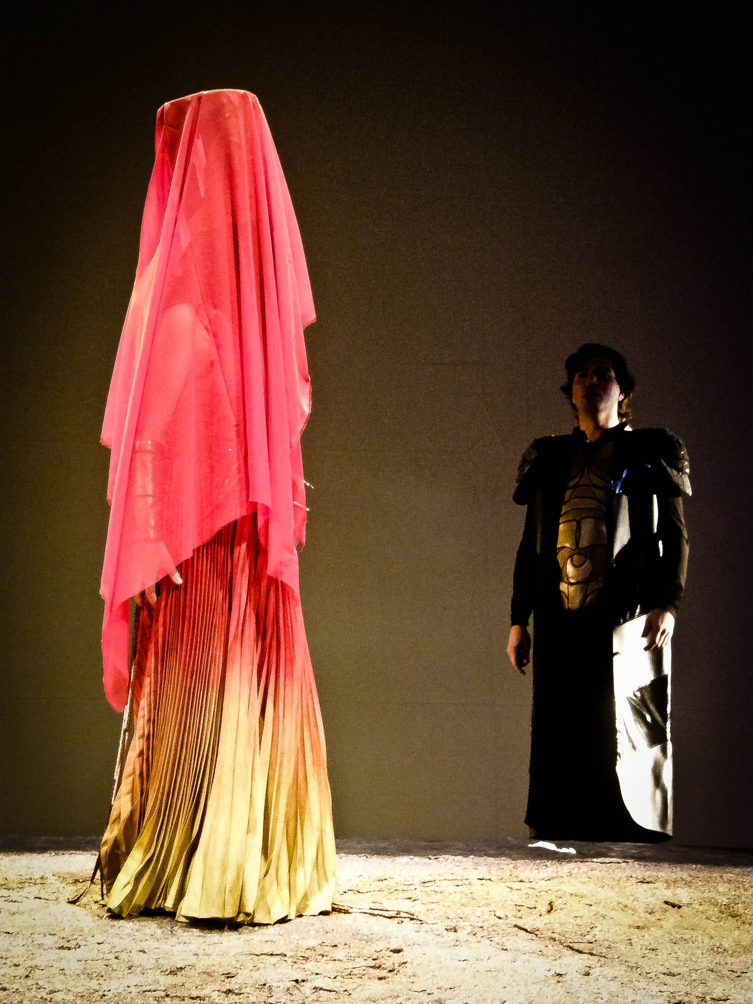 Direi che è una storia un po’ diversa. Direi anche che Didone sapeva benissimo cavarsela da sola. Tuttavia il finale rimane tragico e noi dovevamo, in un modo o nell’altro raccontarlo. Come dicevo, ho scelto di estraniare la storia dai limiti temporali, di raccontarne principalmente l’estrema drammaticità che concerne più un personale percorso di Didone che l’effettiva relazione con Enea. La regina è la sua terra, vive all’interno di confini che essa stessa si è data ed evolve verso la morte più a causa della sua parte “oscura” che dell’amore non corrisposto. La storia di Purcell ben di presta a questa interpretazione perchè il male ci viene rappresentato attraverso il personaggio della Sourceless, la maga malvagia, che, con la regista, è stata configurata come l’esatto alter-ego della regina. In tutto ciò Enea è semplicemente l’uomo che viene dal mare e che al mare ritorna. Didone ed Enea sono in un certo senso uguali ed opposti, sono entrambi sovrani ed entrambi esiliati, ma mentre la prima è roccia, terra, sabbia, è il presente, il qui e ora, l’altro è acqua, corrente, è lo scorrere, il futuro. Per questo si attirano e respingono e per questo non possono stare insieme. Hanno destini differenti, che nello spettacolo sono stati resi con un’attenzione estrema ai dettagli nella definizione dei costumi e dei colori che li rappresentano.