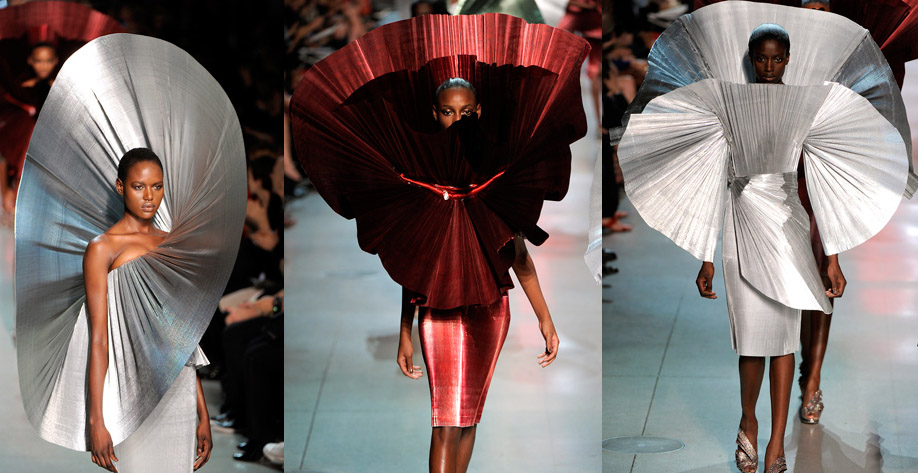 Questo non è vero soltanto perchè molti stilisti sono architetti (una vota era molto meno specifica la distinzione tra le diverse forme di design), Ferrè ad esempio; e viceversa, oggi, molti architetti nel loro delirio di onnipotenza disegnano anche vestiti e scarpe (Zaha Hadid, chi altro, che così eleva il consolidato diverbio tra architetti ed architette), ma perchè la creazione di un abito, il suo taglio, il suo disegno appunto, molto hanno a che fare con la geometria.