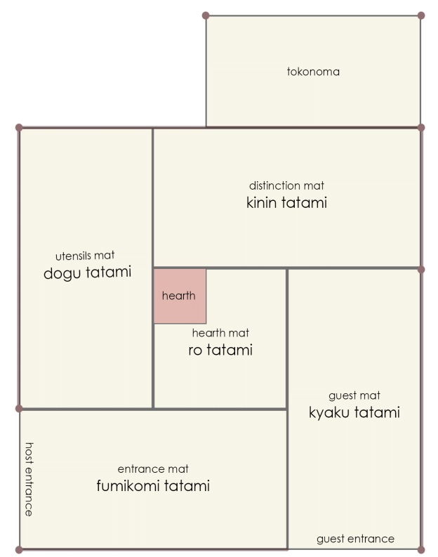 E’ abbastanza naturale che in una tradizione così codificata il chashitsu abbia una conformazione obbligatoria che si costituisce nel seguente modo. Innanzitutto la stanza del tè ha dimensioni più ridotte ed un natura più umile paragonata ad una stanza comune, per tutti i motivi analizzati in precedenza. Le sue componenti essenziali sono: un pavimento costituito da tatami, un focolare (ro) incassato nel pavimento e utilizzato per scaldare il bollitore durante la stagione invernale (in estate viene sostituito da un braciere), una nicchia (tokonoma) sul lato sud con un pilastro ad angolo (tokobashira) che ne costituisce parte della composizione, un rotolo di carta o stoffa appeso alla sua parete ed un fiore piuttosto che un’opera d’arte. L’entrata del chashitsu inoltre è sempre stretta e bassa (nijiriguchi) in modo da costringere gli invitati ad entrare carponi, mentre l’ospite ha un ingresso separato che dà accesso diretto alla stanza della preparazione, o mizuya. Le finestre presenti (mado) sono ricoperte da shouji, pannelli di carta giapponese, inoltre spesso affacciano sul giardino.