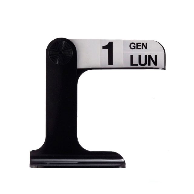 Last but not least: l’agenda. L’architetto non ha generalmente agenda, ha quaderni senza righe su cui si appunta schizzi volanti. La propria agenda se la compone. Allora perché no, un calendario, anzi IL calendario: il calendario perpetuo di Enzo Mari. Inventato nel 1967 ed ispirato ai tabelloni ferroviari, è perpetuo perché contiene numeri e lettere per indicare ogni giorno la data del momento.