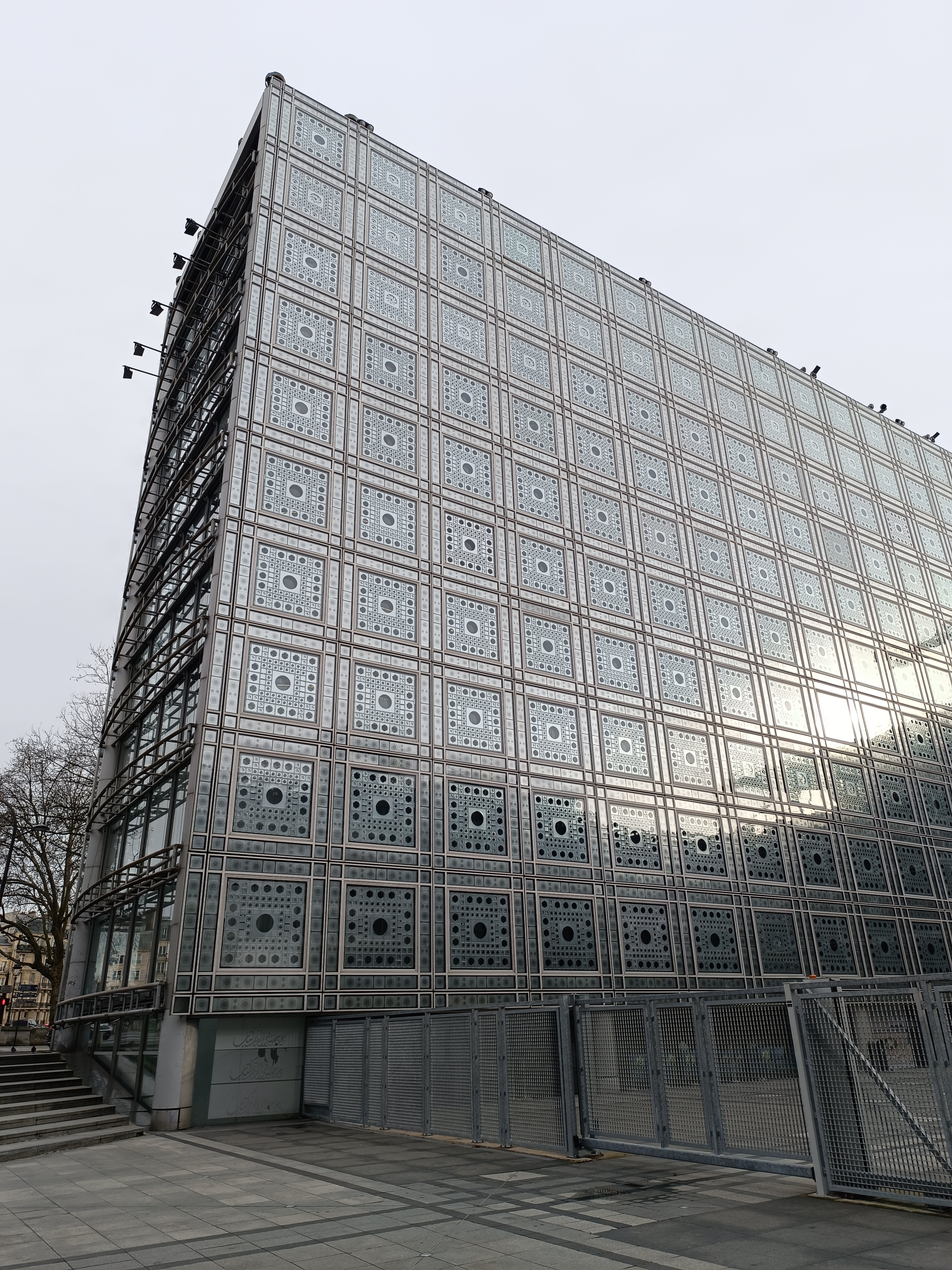 Questo è quello che fa anche Jean Nouvel nel suo progetto: prende un elemento dell’architettura araba tradizionale, i musharabia – paraventi in legno intarsiati che regolano l’ingresso della luce all’interno degli ambienti – e li traduce in motivi altamente tecnologici in alluminio con la stessa funzione, che regolano l’ingresso della luce nella grande facciata in vetro che si affaccia sul grande spiazzo d’ingresso.