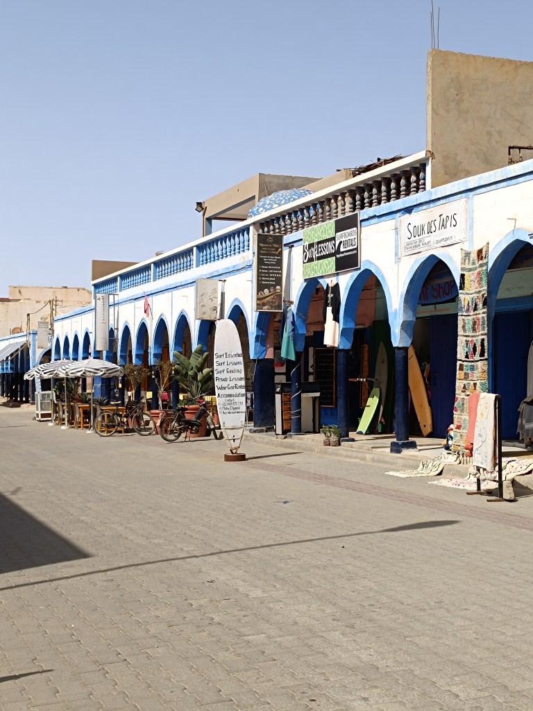 Andando invece molto più a Sud di arriva a Mirleft, cittadina stupenda, ancora poco conosciuta dal turismo europeo. Anche qui la prevalenza è di surfers e skaters, anche se la corrente picchia molto di più perciò è per un livello più avanzato. Il centro città sembra uscito da uno spaghetti Western per via dei porticati di origine coloniale bianchi ed azzurri. La cittadina è dominata dai resti di una roccaforte da cui si vede tutto l’Oceano, mentre proseguendo verso Sud, alla spiaggia di Lepziga si incontra uno stupefacente arco di pietra attraversato dal mare. Noi abbiamo visitato la spiaggia in una giornata di nebbia e tempo grigio e l’impressione era quella di essere in una dimensione parallela.